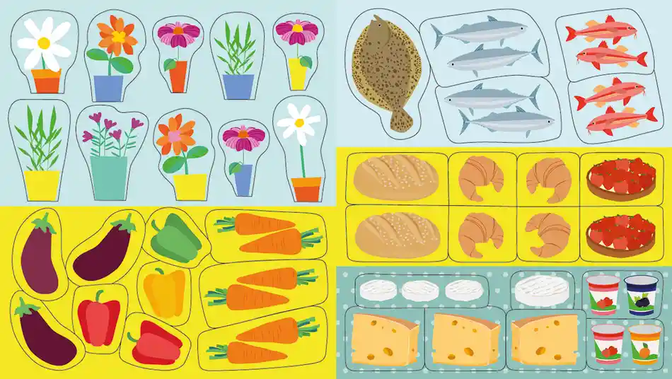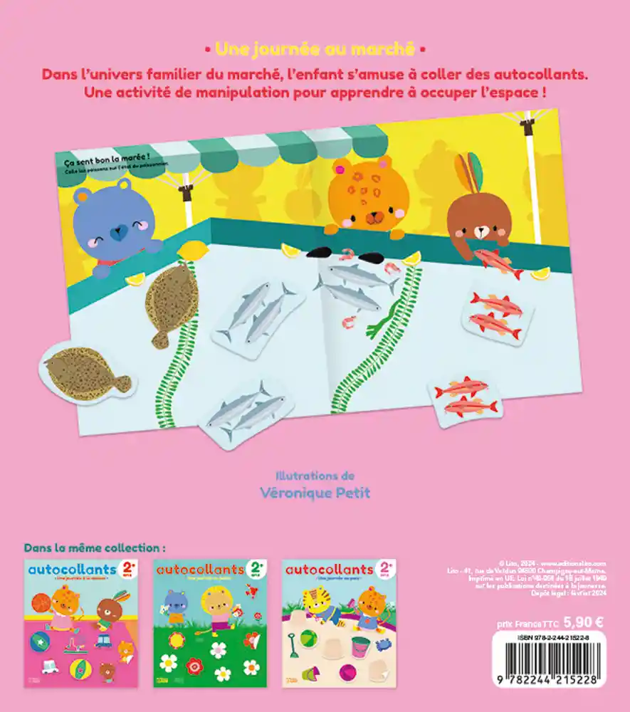 Dans l’univers familier du marché, l’enfant s’amuse à coller des autocollants, comme il le souhaite, sur de grandes surfaces délimitées. Une activité lui permettant de développer sa dextérité et d’apprendre à occuper l’espace de la page !