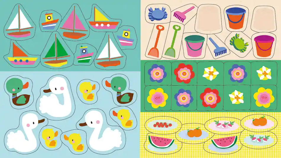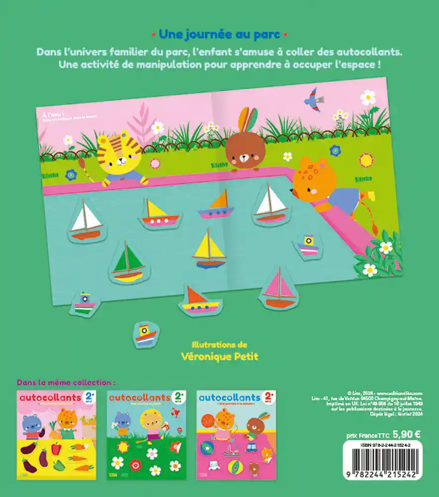 Dans l’univers familier du parc, l’enfant s’amuse à coller des autocollants, comme il le souhaite, sur de grandes surfaces délimitées. Une activité lui permettant de développer sa dextérité et d’apprendre à occuper l’espace de la page !